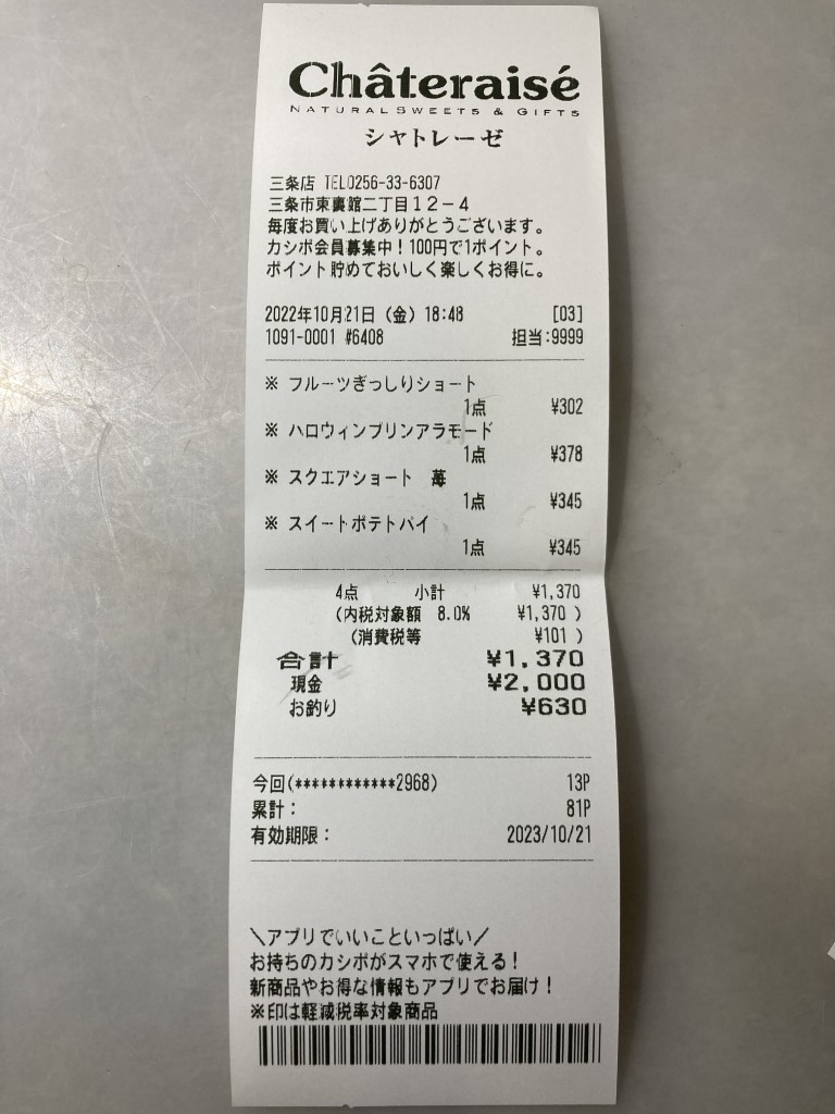 💰本日のお会計/シャトレーゼ 三条店